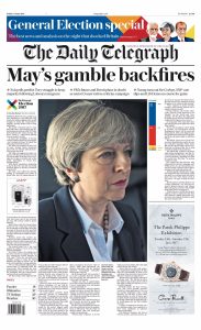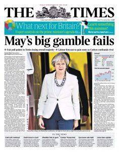 Ακόμα οι δεξιές φυλλάδες που έπαιξαν άγρια υπέρ του Brexit και στήριξαν τους Συντηρητικούς και τη Μέι, σήμερα το πρωί κυκλοφόρησαν με ένα κοινό συμπέρασμα και προσωποποιώντας το εκλογικό αποτέλεσμα: ο τζόγος της Μέι εκπυρσοκρότησε. Ούτε τρομοκρατία, ούτε άλλοι λόγοι. Η υπόθεση αυτών των εκλογών είχε πρόσωπο. Και προσωπική είναι η αποτυχία.