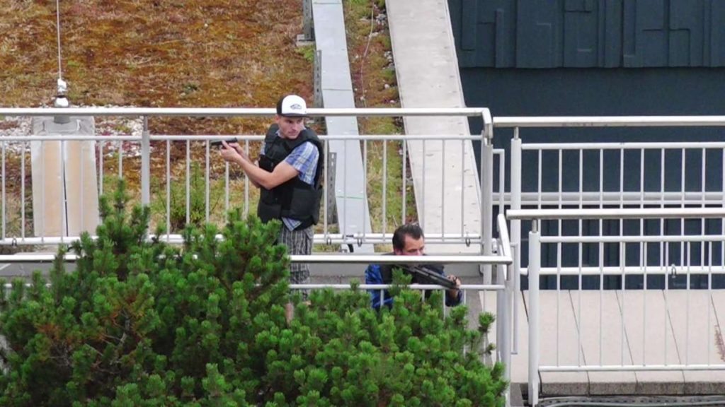 Στο πλάνο του βίντεο που κυκλοφορεί στα social media χωρίς να έχει επικυρωθεί η πηγή του από τις Αρχές, ο δράστης βρίσκεται στην ταράτσα κτιρίου χώρου στάθμευσης –εκεί κατευθύνθηκε μετά το χτύπημα στο εμπορικό κέντρο- ντυμένος στα μαύρα και περπατάει νευρικά μπρος πίσω. Ο άνδρας που κρατά την κάμερα –βρίσκεται μαζί με άλλους στο μπαλκόνι διπλανού κτιρίου με θέα την ταράτσα- αρχίζει να φωνάζει στον ένοπλο άνδρα που βλέπει απέναντί του. Ενημερώνει τα άτομα που βρίσκονται μαζί του ότι ο άνδρας έχει όπλο.