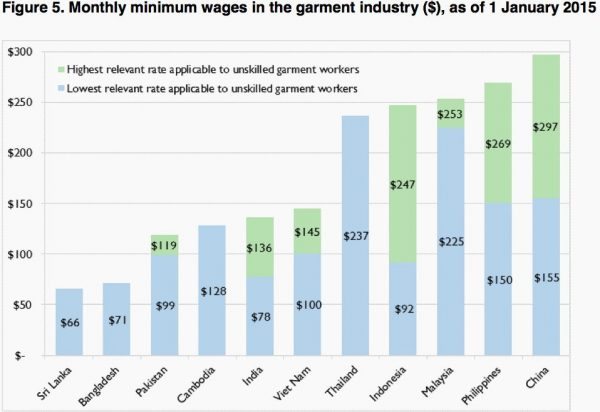Στον πίνακα του Διεθνούς Οργανισμού Εργαζομένων, που ακολουθεί, και περιέχει μετρήσεις που ίσχυαν την 1η Ιανουαρίου 2015, φαίνεται ξεκάθαρα πόσο πληρώνεται μία ανειδίκευτη μοδίστρα που εργάζεται στη βιομηχανία της μόδας στις χώρες όπου παράγονται στην, συντριπτική πλειονότητά τους, τα ρούχα που φοράμε σήμερα.