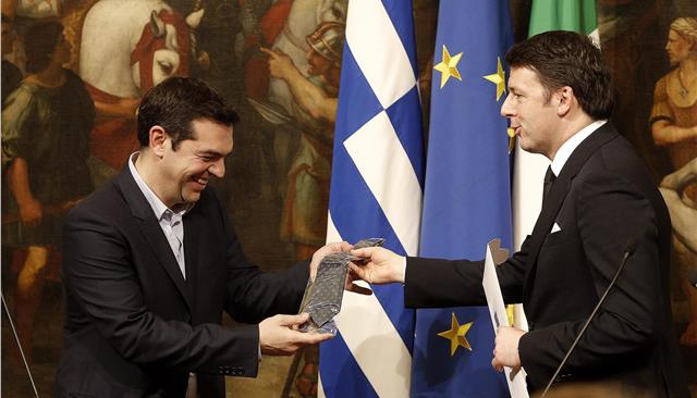 Ηταν Φεβρουάριος του 2015, όταν ο Ματέο Ρέντσι είχε κάνει δώρο μία γραβάτα στον Αλέξη Τσίπρα (φωτ. κάτω), με εκείνον να του απαντά: «υπόσχομαι να τη φορέσω όταν θα βρούμε την κοινά αποδεκτή λύση με την Ευρώπη». Και σήμερα, όπως είπε στον Πρόεδρο της Δημοκρατίας ψάχνει για… κατάλληλο πουκάμισο ώστε να βάλει τη γραβάτα.