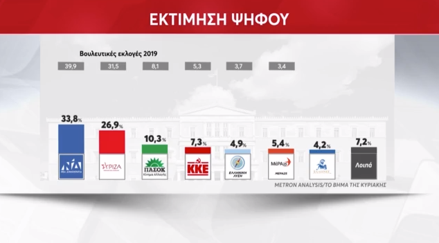Δημοσκόπηση Metron Analysis: Στο 6,9% άνοιξε το προβάδισμα της ΝΔ