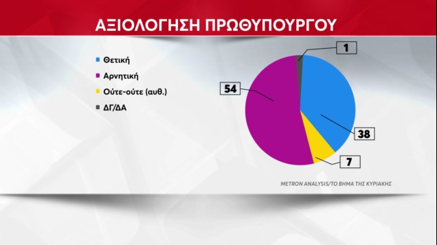 Σταθερή εμφανίζεται και η αξιολόγηση του Πρωθυπουργού και προέδρου της ΝΔ, καθώς το 54% των ερωτηθέντων έχουν αρνητική γνώμη με το 38% να κρίνει θετικά τον κ. Μητσοτάκη.