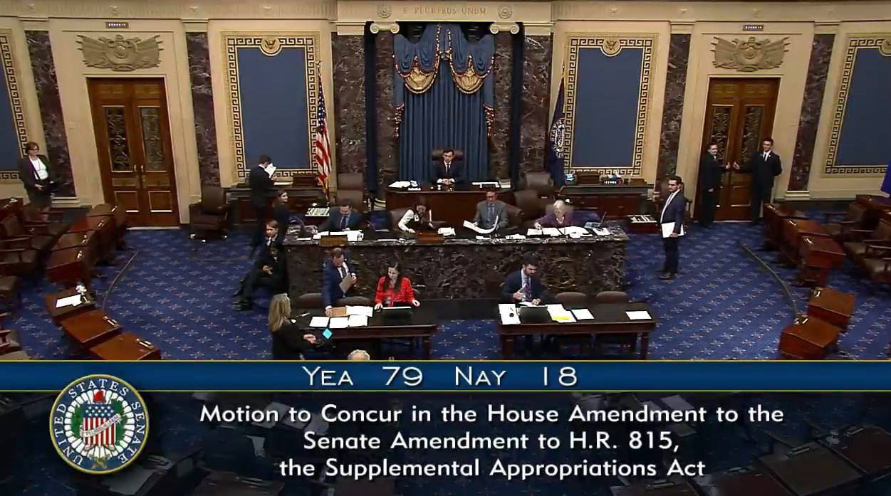 Το πακέτο χρηματοδοτήσεων, που συμπεριλαμβάνει επίσης κεφάλαια για το Ισραήλ, την Ταϊβάν, και άλλες περιοχές αμερικανικών συμφερόντων, καθώς και τελεσίγραφο στην κινεζική πλατφόρμα TikTok, εγκρίθηκε με εξαιρετικά ευρεία πλειοψηφία από τη Γερουσία, με ψήφους 79 υπέρ και 18 κατά.