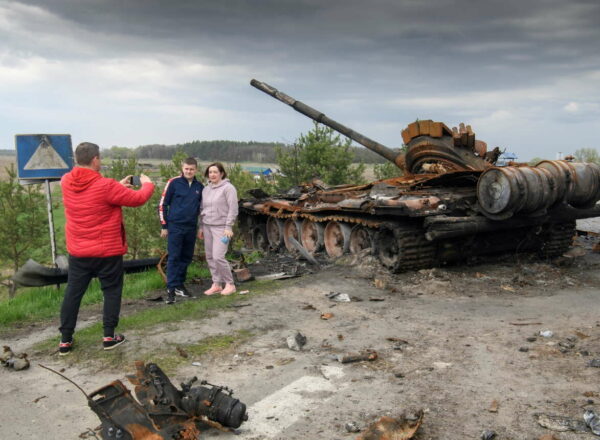 Πηγαίνοντας στα σπίτια τους ή ψάχνοντας να ανταμώσουν ξανά με τους δικούς τους ανθρώπους, οι ουκρανοί πολίτες κοιτούν ό,τι έμεινε από τα κατεστραμμένα ρωσικά άρματα, κάνουν μια στάση και πλησιάζουν. «Θα με φωτογραφίσεις;», ρωτάει μια γυναίκα τη φίλη της. «Θέλω να έχω ένα ενθύμιο από αυτή την τραγωδία».