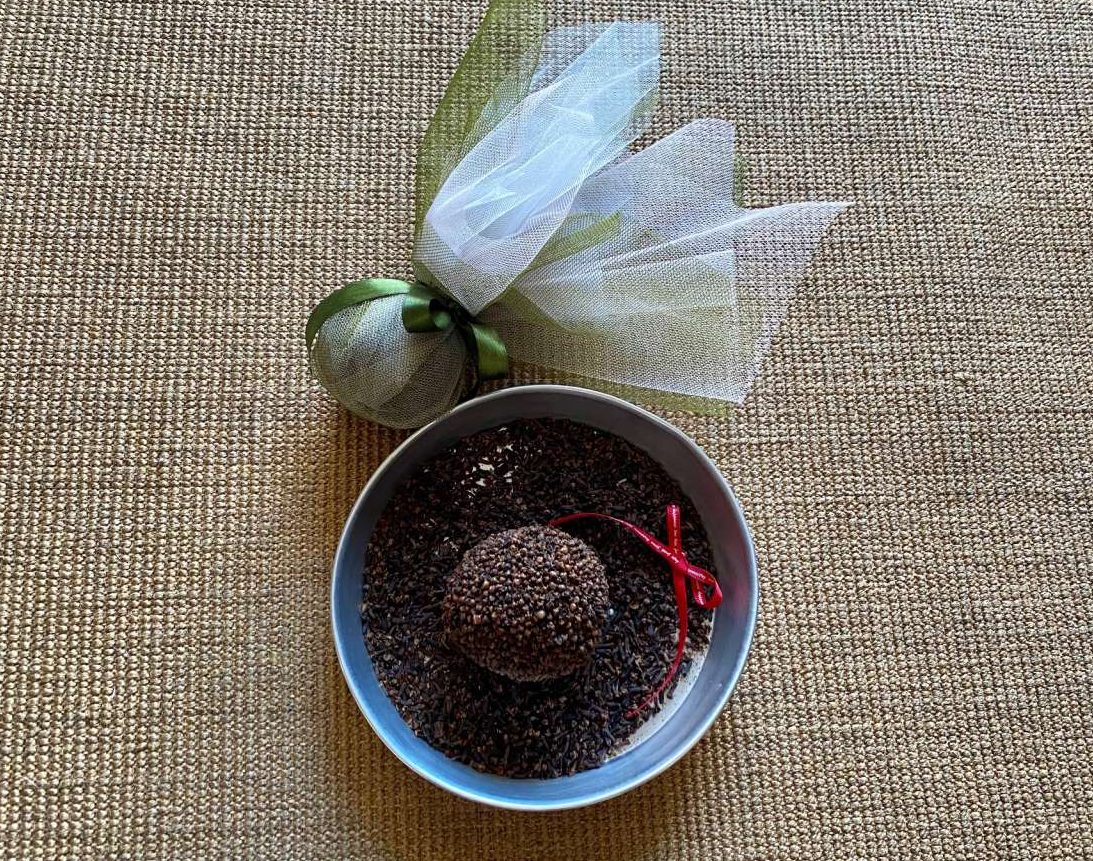 Στολίστε τα τραπέζια με μεγάλα ξύλα κανέλας πιασμένα με κορδέλες και πορτοκάλια, στα οποία θα μπήξετε γαρίφαλα έτσι ώστε να καλυφθεί όλη η επιφάνειά τους. Είναι το τέλειο αρωματικό. Και ένα ωραίο χειροποίητο δώρο. Τυλίξτε το απλά με τούλι σαν μπομπονιέρα, θα το χαρούν πολύ οι δικοί σας.