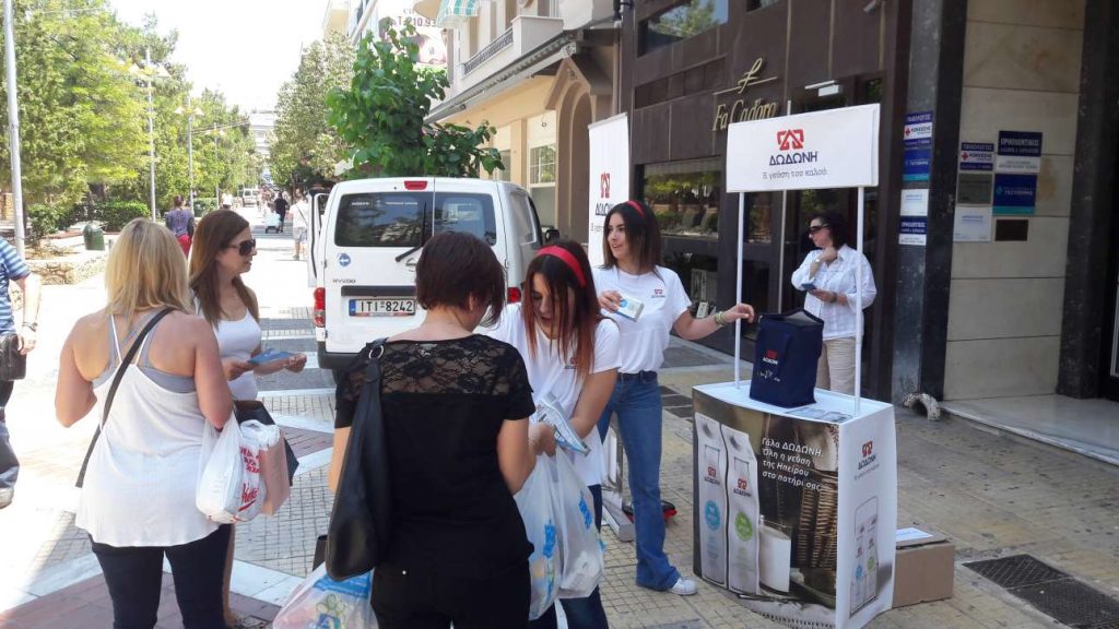 Ηταν μια πρωτοβουλία της εταιρείας ειδικά για την ημέρα. Οι περαστικοί δεν γνώριζαν για την προσφορά αλλά αυτό δεν σημαίνει ότι εν τέλει δεν απομακρύνονταν ευχαριστημένοι με ένα κουτάκι γάλα και ένα εκπτωτικό κουπόνι ανά χείρας. «Σε λίγο θα κάνουμε ένα διάλειμμα γιατί έχει αφόρητη ζέστη» μας ενημέρωσε η Μαρία Σταύρου από την ΔΩΔΩΝΗ. «Είμαστε εδώ από τις 10 και θα μείνουμε μέχρι τις 8 το βράδυ» συμπλήρωσε μια ευγενική κοπέλα που έριχνε κρυφές ματιές για να προσεγγίσει κάποιον περαστικό.