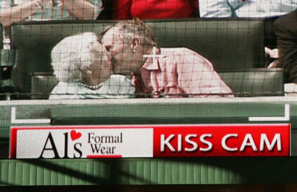Η γυναίκα που παντρεύτηκε τον άντρα που τη φίλησε για πρώτη φορά, δίνει ένα δημόσιο φιλί στον σύζυγό της και αυτό προβλήθηκε σε γιγαντοοθόνη σε γήπεδο του Χιούστον στο Τέξας. (REUTERS/Mike Segar)