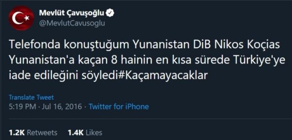 Τώρα, τα έγγραφα που δημοσιοποίησε ο Αμπντουλάχ Μποζκούρτ (Abdullah Bozkurt) τούρκος δημοσιογράφος με έδρα τη Σουηδία, φαίνεται να επιβεβαιώνουν τουλάχιστον αυτό που ο υπουργός Εξωτερικών της Τουρκίας Μεβλούτ Τσαβούσογλου είχε δημοσίως πει από τις πρώτες ώρες μετά το πραξικόπημα: ότι είχε επικοινωνήσει με τον έλληνα ομόλογό του, τον Νίκο Κοτζιά τότε, ο οποίος τον είχε διαβεβαιώσει ότι οι Οκτώ θα επιστραφούν στην Τουρκία το συντομότερο δυνατόν.