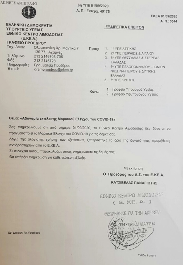 Ετσι, με εξαιρετικά επείγουσα επιστολή που απέστειλε το ΕΚΕΑ στο υπουργείο Υγείας και τις Υγειονομικές Περιφέρειες της χώρας (ΥΠΕ) που εξυπηρετεί (αφορούν τα νοσοκομεία της Αθήνας, του Πειραιά και των νησιών, της Στερεάς Ελλάδας, της Θεσσαλίας της Πελοποννήσου καθώς και της Κρήτης), ζητά να σταματήσουν να στέλνουν δείγματα για τεστ, καθώς όπως υπογραμμίζει «το Εθνικό Κέντρο Αιμοδοσίας δεν δύναται να πραγματοποιεί τον Μοριακό Ελεγχο της Covid-19 για τις δομές σας. Λόγω της αλόγιστης χρήσης των εξετάσεων, ξεπεράστηκε το όριο της δυνατότητας προμήθειας αντιδραστηρίων από το ΕΚΕΑ».