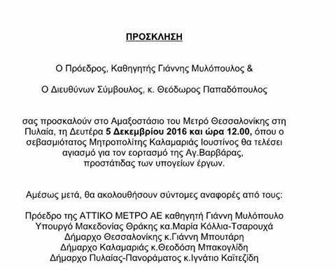 Βλέποντας την πρόσφατη πρόσκληση της «Αττικό Μετρό ΑΕ» δαγκώνεσαι, κάνεις τον σταυρό σου: Τη Δευτέρα 5 Δεκεμβρίου του σωτηρίου 2016 στο Αμαξοστάσιο της Πυλαίας στη Θεσσαλονίκη θα τελεσθεί αγιασμός από τον Μητροπολίτη Καλαμαριάς, παρουσία υπουργού Β. Ελλάδος, δημάρχων και ιθυνόντων του Μετρό-γιοφυριού της πόλης για τον εορτασμό της Αγίας Βαρβάρας, προστάτιδας των υπογείων έργων.