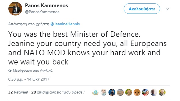 1. Ο Πάνος Καμμένος γράφει εγγλέζικα. Εκτός και αν «το παιδί» χάκαρε πάλι τον λογαριασμό του, είναι ο υπουργός Αμυνας που αποχαιρετά την απερχόμενη ομόλογό του στο Αμυνας της Ολλανδίας Τζανίν Χένις. Με φρικτά αγγλικά που θυμίζουν ελληνικό καμάκι.