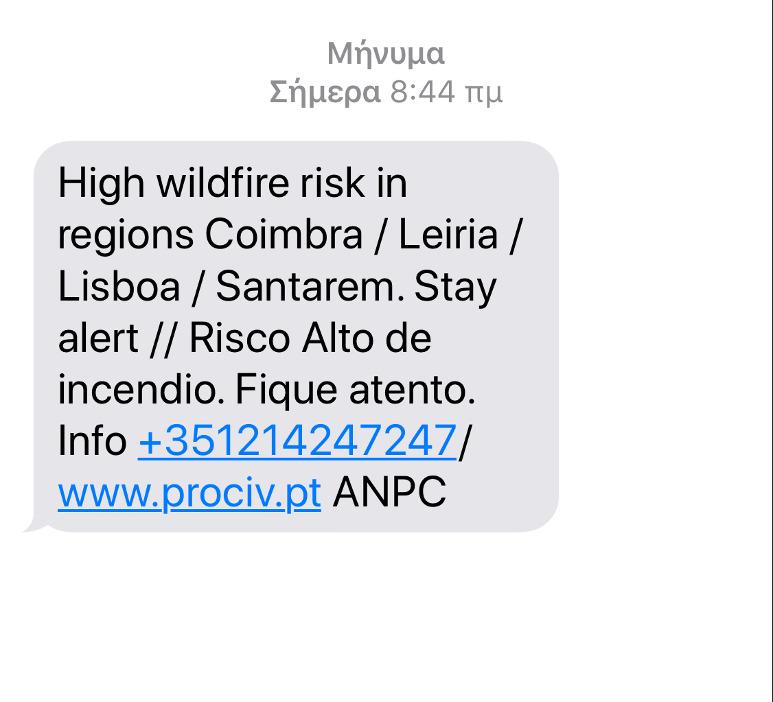 Το μυαλό μου πήγε εκεί που θα πήγαινε το μυαλό καθενός από εμάς. Στα μηνύματα που δεν εστάλησαν, στις σειρήνες και στις καμπάνες που δεν χτύπησαν στο Μάτι. Δεν μπορώ να γνωρίζω πόσο πιο έτοιμο για να αντιμετωπίσει μια μεγάλη φωτιά είναι το πορτογαλικό κράτος από το (επιβεβαιωμένα ανέτοιμο) ελληνικό κράτος. Αυτό όμως το τυποποιημένο μήνυμα, με έκανε να αισθανθώ πως κάποιος ενδιαφέρεται, ακόμα και για εμένα που είμαι ένας περαστικός. Με έκανε να νιώσω με έναν τρόπο πιο ασφαλής. Και αυτό, η αίσθηση της ασφάλειας, είναι εξαιρετικά σημαντικό όταν είσαι ξένος σε μια άλλη χώρα. Οπως είναι σημαντικό και για να μην αισθάνεσαι ξένος και αναλώσιμος στη χώρα σου.