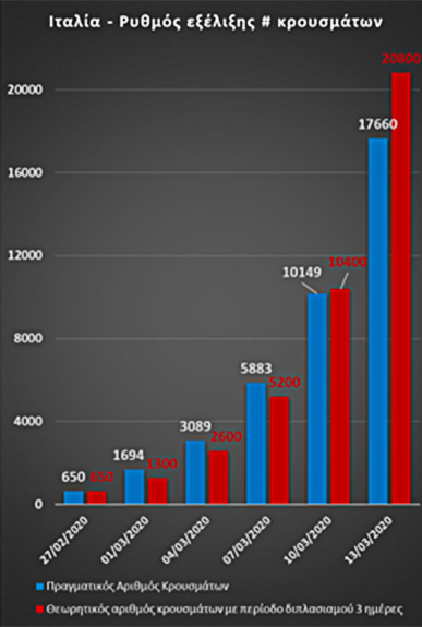 Στην Ιταλία μέχρι σήμερα (14/3) έχουν πεθάνει 1441 άτομα. Αυτό σημαίνει ότι τα πραγματικά κρούσματα 15 μέρες πριν (28/2) ήταν 20 φορές περισσότερα ~29 χιλιάδες. Μέσα σε διάστημα των 9 ημερών (> 2 περιόδους πολλαπλασιασμού) που μεσολάβησαν από την 28/2 μέχρι τις 8/3, τα κρούσματα τετραπλασιάστηκαν και άρα την 8/3 ανέρχονταν σε τουλάχιστον 116 χιλιάδες.