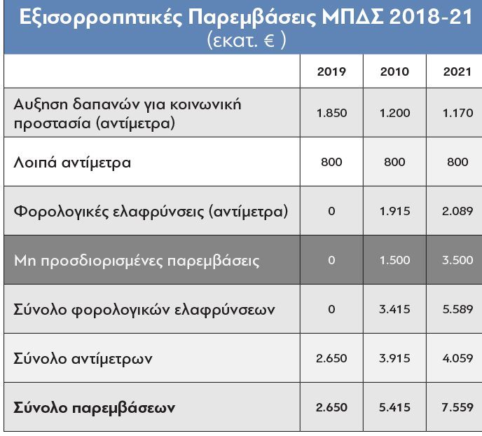 Πίνακας ΙΙΙ: Εξισορροπητικές Παρεμβάσεις 2019-2021– Αντίμετρα και πρόβλεψη για πρόσθετα μέτρα στα πλαίσια του ΜΠΔΣ. Πηγή: Εισηγητική έκθεση ΜΠΔΣ, Πίνακας 3.5Β, σελ. 200 εδώ. Με γκρι γραμμοσκίαση εμφανίζονται τα ποσά που αντιστοιχούν σε πρόβλεψη για φορολογικές ελαφρύνσεις λόγω αύξησης του ΑΕΠ, αυτά που αυθαιρέτως ο υπουργός προσμετρά στα αντίμετρα.