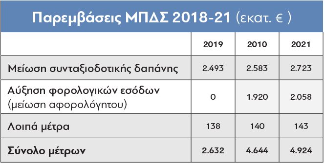 Πίνακας ΙΙ: Παρεμβάσεις – Μέτρα για την τριετία 2019-2021 στα πλαίσια του ΜΠΔΣ. Πηγή: Εισηγητική έκθεση ΜΠΔΣ, Πίνακας 3.5Α, σελ. 198 εδώ.