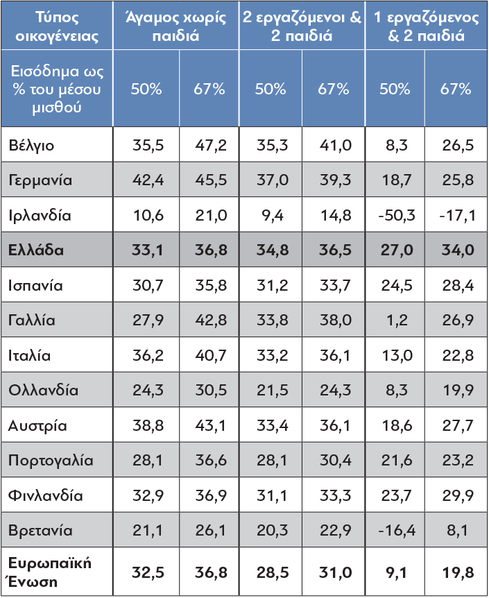 Πίνακας 1: Συνολική επιβάρυνση του εισοδήματος από φόρους & εισφορές για μισθωτούς με εισόδημα 50% & 67% του μέσου μισθού1. Πηγή Eurostat tax wedge εδώ. Τα αρνητικά ποσοστά σε κάποιες χώρες σημαίνουν ότι ο εργαζόμενος εισπράττει μέσω επιδομάτων & επιστροφών περισσότερα απ’ όσα εισφέρει.