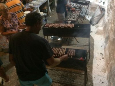 Στο κέντρο του προαυλίου βρίσκονται μερικά δένδρα που, το βράδυ του πανηγυριού κάνουν τα κλαδιά τους χέρια, για να χορέψουν τις μαριονέτες από κάτω. Πλαστικά τραπέζια και καρέκλες, αλλά και ξύλινοι πάγκοι. Μία μικρή ψησταριά με απλωμένα καμιά διακοσαριά σουβλάκια, 1,5 ευρώ το τεμάχιο. Τσάμπα το ψωμί, 2,5 ευρώ το πιατάκι η φέτα. Και μία γούρνα γεμάτη πάγο με μπύρες και αναψυκτικά. Αυτά.