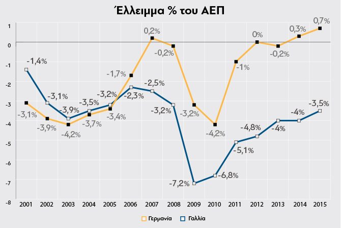 Την περίοδο 2001-2007 Γαλλία (12,9%) & Γερμανία (12,7%) είχαν παρόμοια συνταξιοδοτική δαπάνη ως % του ΑΕΠ και παρόμοια επίδοση στα δημοσιονομικά ελλείμματα (Γαλλία -2,8% και Γερμανία -2,8%).