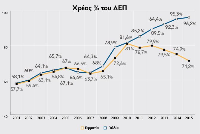 Το χρέος της Γαλλίας ήταν χαμηλό πριν τη κρίση, στα όρια της συνθήκης του Μάαστριχτ. Από το 2007 μέχρι το 2010 το χρέος της Γαλλίας αυξήθηκε από 64% του ΑΕΠ σε 82%. Το ίδιο συνέβη και στη Γερμανία (Διάγραμμα ΙΙΙ). Εκείνη την περίοδο η αύξηση του χρέους ήταν γενικό φαινόμενο λόγω της χρηματοπιστωτικής κρίσης. Γαλλία και Γερμανία είχαν κοινή πορεία μέχρι το 2010. Μετά, οι δρόμοι τους αποκλίνουν: η Γερμανία ακολουθεί περιοριστική οικονομική πολιτική με πρωτογενή πλεονάσματα ενώ η Γαλλία επεκτατική με πρωτογενή ελλείμματα. Το χρέος της Γαλλίας διογκώνεται, το χρέος της Γερμανίας μειώνεται.