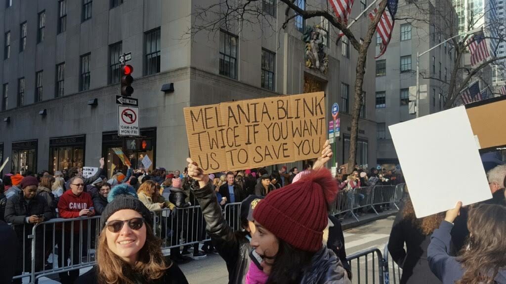 Στις διαδηλώσεις κατά του Ντόναλντ Τραμπ από τις γυναικείες οργανώσεις έκανε την εμφάνισή του ένα πανό που έγραφε το εξής: «Μελάνια, αν θέλεις να σε σώσουμε ανοιγόκλεισε τα μάτια σου δύο φορές». Η φράση αυτή που χρησιμοποιείται ευρέως στις ταινίες και τις σειρές για να διαπιστώσουν οι αστυνομικοί αν κάποιος βρίσκεται σε κατάσταση ομηρείας, γράφτηκε προφανώς ως αστείο. Αλλά μέσα σε λίγες ώρες το αστείο σοβάρεψε. Και ξαφνικά όλοι θέτουν το θέμα της trophy wife σε μια βαθιά ανθρωπιστική βάση.