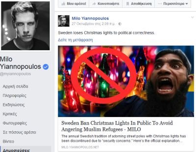 Όμως ο Μίλο δεν έγραφε την αλήθεια. Το απαγορευτικό στα χριστουγεννιάτικα λαμπιόνια εκδόθηκε για τους πυλώνες μεταφοράς ρεύματος καθώς οι αρχές θεώρησαν ότι υπήρχε υψηλός κίνδυνος ηλεκτροπληξίας. Αλλά στις μέρες μας το προφανές είναι δύσκολο να αποδείξει τη σχέση του με τη λογική. Οσο πιο κραυγαλέο γίνεται κάτι, τόσο θα ακούγεται με μεγαλύτερη ένταση. Και είσαι εσύ σε ένα απομακρυσμένο χωριό του Μίσιγκαν, μέσα στα χιόνια, διαβάζοντας στην timeline ότι οι Σουηδοί δεν θα ανάψουν φώτα λόγων των μουσουλμάνων. Σιγά μην κάτσεις να ψάξεις τη θέση της σουηδικής κυβέρνησης. Το καταπίνεις αμάσητο, με μια γουλιά τζιν.
