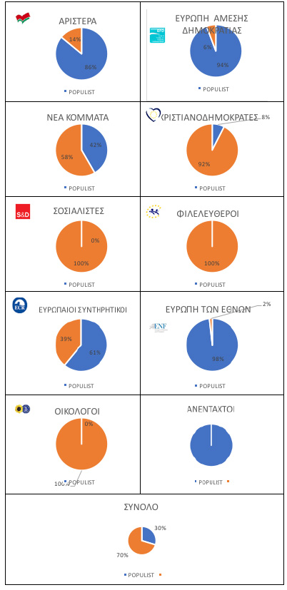 Σε ποιες όμως πολιτικές ομάδες ανήκουν τα λαϊκιστικά κόμματα;. Τα παρακάτω διαγράμματα δείχνουν το ποσοστό που κατέχουν οι λαϊκιστές στις διάφορες πολιτικές ομάδες.