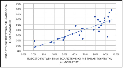 Το ένα είναι η ΜΗ ικανοποίηση των πολιτών από τη λειτουργία της δημοκρατίας στο κράτος τους και το άλλο είναι η αντίληψη για την έκταση της διαφθοράς που υπάρχει στο κράτος τους. Είναι ολοφάνερο ότι όσο αυξάνει η αίσθηση της διαφθοράς τόσο αυξάνει η δυσπιστία προς τη λειτουργία της δημοκρατίας. Μερικές φορές τα συστημικά κόμματα, θέλοντας να κερδίσουν μερικές ψήφους, δεν διστάζουν να χρησιμοποιήσουν την σκανδαλολογία. Όμως μακροπρόθεσμα νομιμοποιούν τους λαϊκιστές να κατεδαφίζουν τη δημοκρατία.