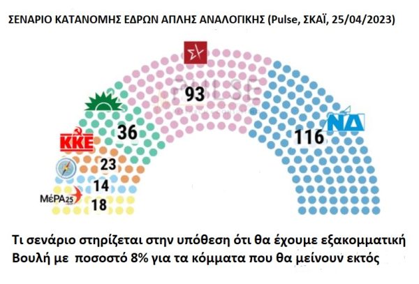 Για παράδειγμα, με βάση το σενάριο κατανομής εδρών στην κάλπη της απλής αναλογικής στη δημοσκόπηση της Pulse που παρουσίασε ο ΣΚΑΪ την Τρίτη (25/4), η ΝΔ λαμβάνει 116 έδρες, ο ΣΥΡΙΖΑ 93, το ΠΑΣΟΚ 36, το ΚΚΕ 23, το ΜέΡΑ25 18 έδρες και η Ελληνική Λύση 14 έδρες. (Το σενάριο προβλέπει εξακομματική Βουλή με 8% για τα κόμματα εκτός Βουλής)