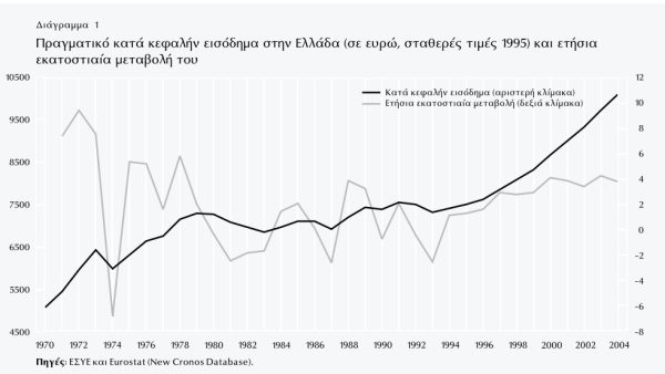 Η εξέλιξη του κατά κεφαλήν εισοδήματος από το 1971 έως το 2004 (ΤτΕ με στοιχεία Eurostat). Ξεχωρίζει το άλμα από το 1994 έως το 2004: