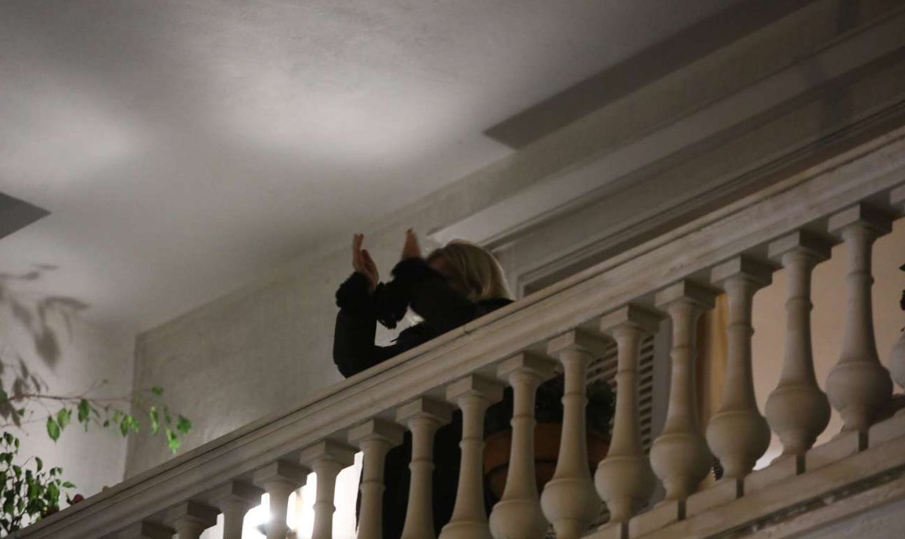 «Μπράβο!», «ευχαριστούμε!», έβρεχε φωνές και σφυρίγματα από παντού, η επιβράβευση ήταν παρατεταμένη, ήταν πια εννιά και πέντε, μα δεν έλεγαν να ξαναμπούν στα διαμερίσματά τους. Οι «Μένουμε Σπίτι» στα ντουζένια τους.