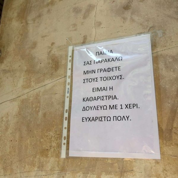 Στην είσοδο μιας πολυκατοικίας στην πλατεία Βικτωρίας έχουν κολλήσει ένα χαρτί όπου διαβάζω: «Παιδιά σας παρακαλώ μην γράφετε στους τοίχους. Είμαι η καθαρίστρια. Δουλεύω με 1 χέρι. Ευχαριστώ». Είναι γραμμένο με κεφαλαία γράμματα, τυπωμένο σε Α4, τοποθετημένο μέσα σε ζελατίνα για να προστατεύεται από τις φθορές. Το διάβασα βιαστικά και συνέχισα το δρόμο μου αλλά, δεν είχα φτάσει στην επόμενη γωνία, επέστρεψα και το φωτογράφησα. Για να το μοιραστώ, να μοιραστώ την απόγνωση μιας σκληρά εργαζόμενης γυναίκας, με εκείνους που εξακολουθούν να θεωρούν πως η βρομιά, η ακαλαισθησία, η αγένεια και η παρακμή δεν είναι συστατικά της ελεύθερης κοινωνίας.