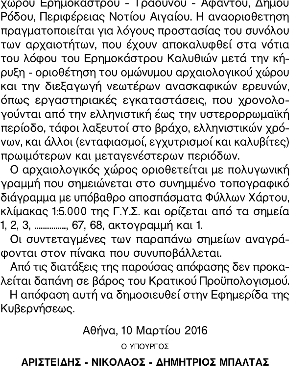 Για την πρόσφατη αναοριοθέτηση, που δημοσιεύθηκε την Πέμπτη 21Απριλίου στο Φ.Ε.Κ. (70/ΑΑΠ) είχε ήδη συγκροτηθεί φάκελος από τις αρμόδιες Υπηρεσίες του Υπουργείου Πολιτισμού βάσει των πρόσφατων αρχαιολογικών ερευνών (ταφές των προϊστορικών, κλασικών, ελληνιστικών και ρωμαϊκών χρόνων, αρχαίες βιοτεχνικές εγκαταστάσεις με κτιριακές υποδομές και κλιβάνους που χρονολογούνται από την ελληνιστική περίοδο έως και την ύστερη αρχαιότητα). Τα όρια της αναοριοθέτησης καθορίστηκαν με κριτήριο τις παλιότερες ανασκαφές, τις νεώτερες αρχαιολογικές έρευνες με αφορμή την παρακολούθηση έργων τρίτων φορέων και τις παραδόσεις αρχαιοτήτων στην περιοχή. Η κήρυξη του εν λόγω αρχαιολογικού χώρου σε καμία περίπτωση δεν στοχεύει στην ακύρωση του επενδυτικού προγράμματος του ΤΑΙΠΕΔ, αντιθέτως βελτιώνει το θεσμικό πλαίσιο της τουριστικής ανάπτυξης στην περιοχή.