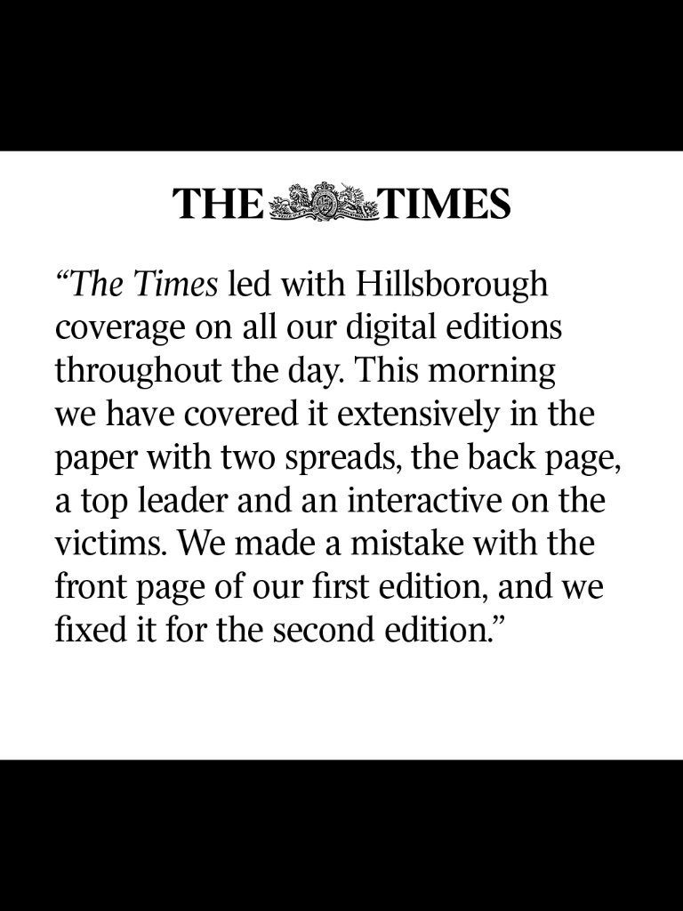 Και έπειτα εξέδωσαν ανακοίνωση: «Oι Times κάλυψαν το Χίλσμπορο όλη τη μέρα διαδικτυακά. Το πρωί καλύψαμε την υπόθεση στο εσωτερικό της εφημερίδας με δύο δισέλιδα, με το οπισθόφυλλο και με ένα διαδραστικό για τα θύματα. Κάναμε ένα λάθος με το πρωτοσέλιδό μας στην πρώτη έκδοση. Το διοθρώσαμε στη δεύτερη έκδοση».
