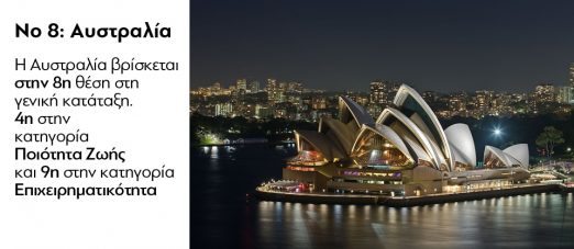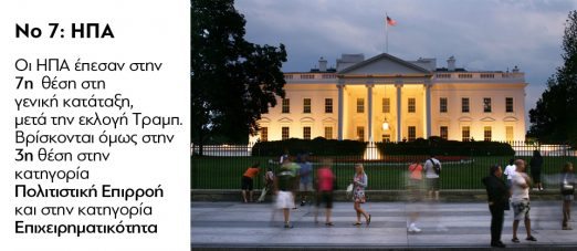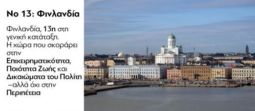 Πιο συγκεκριμένα, η χώρα μας βρίσκεται στην πρώτη τριάδα στην κατηγορία της πολιτιστικής κληρονομιάς. Αντίθετα, βρίσκεται χαμηλά ανάμεσα στις χώρες που προωθούν την επιχειρηματικότητα (57η) και το άνοιγμα επιχειρήσεων (56η), ενώ δεν πήρε καν κατάταξη στις κατηγορίες των καλύτερων χωρών για επενδύσεις ή για να αρχίσεις μία καριέρα. «Οι χώρες με χαμηλά αρχικά σκορ αποκλείστηκαν γιατί η σύγκριση μπορούσε να βγάλει παραπλανητικά αποτελέσματα», όπως εξήγησαν οι επικεφαλής της έρευνας.