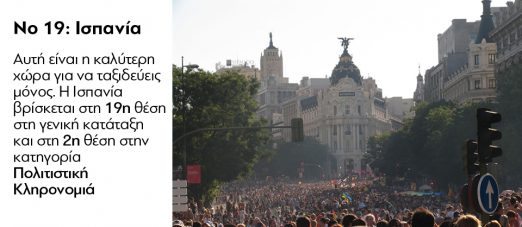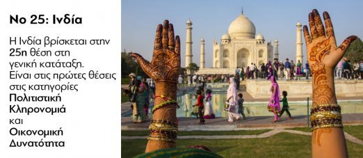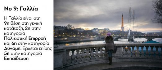 Η Ελλάδα της κρίσης, της ανεργίας, της ανασφάλειας, του Προσφυγικού, βρίσκεται στην 29η θέση! «Σκοράρει» ψηλά στα αποτυπώματα της κληρονομιάς της και στην περιπέτεια που προσφέρει. «Ο ελληνικός πολιτισμός έχει διαμορφώσει μοναδικά χαρακτηριστικά στην επιστήμη, στις τέχνες, στις κοινωνικές επιστήμες και στην κουζίνα. Στην Ελλάδα γεννήθηκε η τραγωδία και το θέατρο, καθώς και επιστήμες όπως η πολιτική επιστήμη. Η ελληνορθοδοξία είναι η κυρίαρχη θρησκεία, αλλά η ανεκτικότητα στις θρησκείες είναι κατοχυρωμένη στο Σύνταγμα της χώρας», σημειώνει η μελέτη στην περιγραφή.