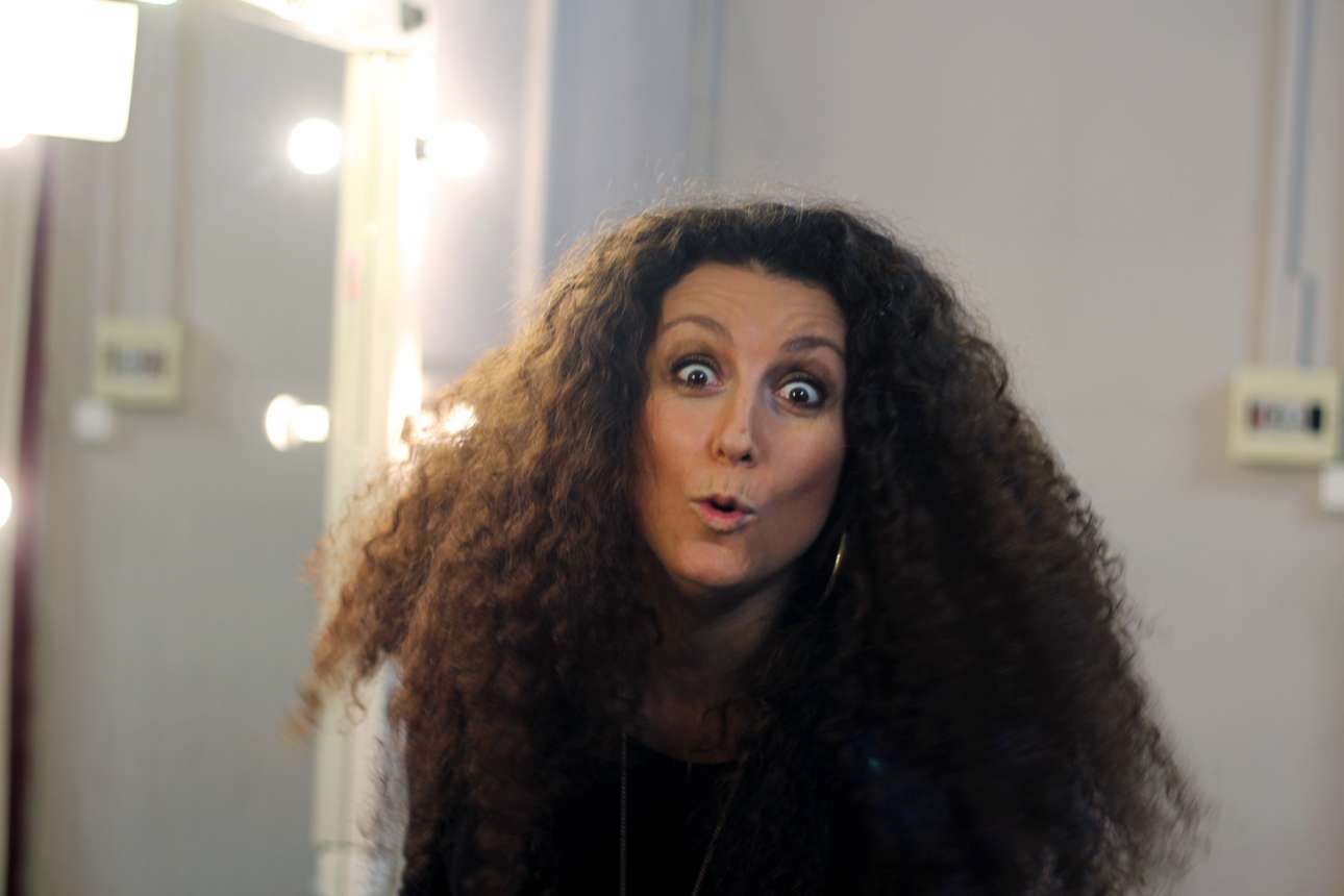 Την είδαμε με μία μικρή βαλίτσα στο χέρι. Μόλις είχε φτάσει από το αεροδρόμιο, ταξίδεψε από την Κομοτηνή στην Αθήνα, απευθείας στο «Θέατρο 104», στο Γκάζι. Κουβαλούσε μία ολόκληρη περιοδεία στην πλάτη της ή ίσως στον υπέροχο όγκο των μαλλιών της, γιατί ακόμη κι αυτά φαίνονταν πεσμένα από την κούραση. Και έπρεπε τη μιάμιση ώρα που είχε ακόμη μπροστά της, πριν από την παράσταση, να την αφιερώσει σε εμάς! Και ύστερα να ανέβει στη σκηνή και να κάνει τη δουλειά της, να κάνει τον κόσμο να γελάσει. Μα, πού θα βρει τη δύναμη να διασκεδάσει ένα κοινό αγνώστων;