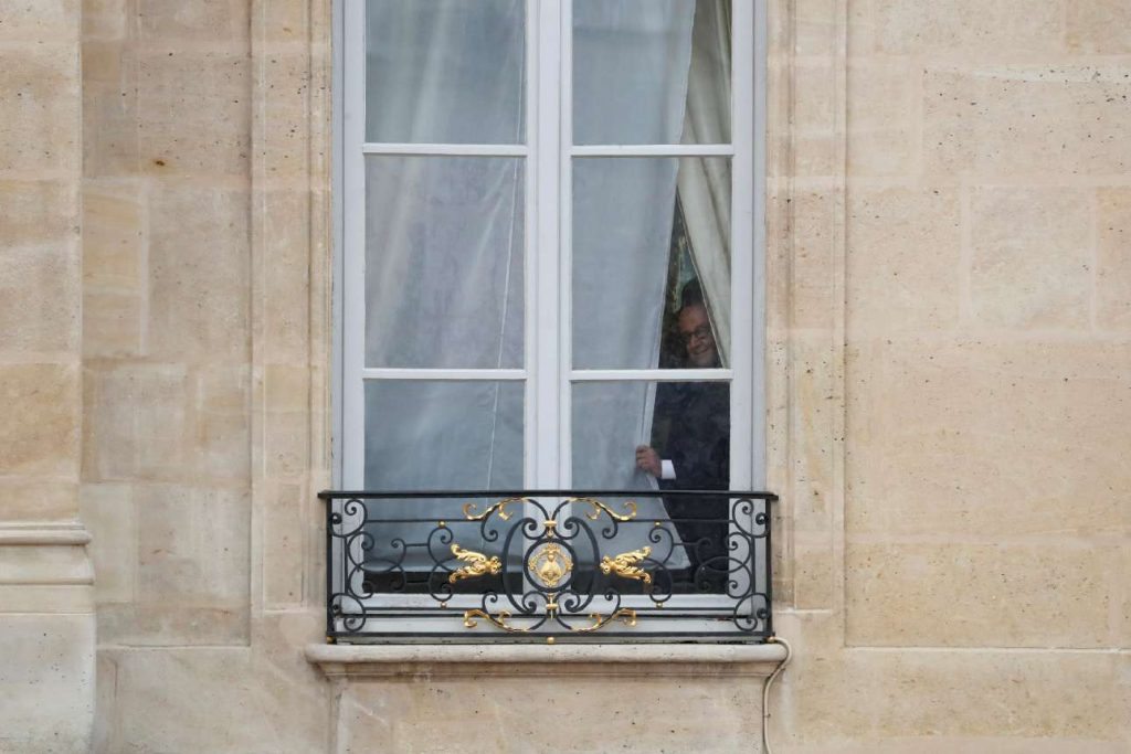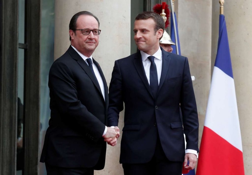 Οι δύο άνδρες αντάλλαξαν μια χειραψία μερικών δευτερολέπτων. Ο Φρανσουά Ολάντ, χαμογελαστός, έβαλε για λίγο το χέρι του στον ώμο του διαδόχου του –τον οποίο είχε επιλέξει ο ίδιος για το υπουργείο Οικονομίας το 2014. Στη συνέχεια οι δυο τους πέρασαν στο προεδρικό γραφείο, το χρυσό σαλόνι του πρώτου ορόφου, για μια συνομιλία που διήρκεσε μισή ώρα.