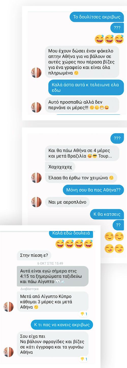 Σε απάντηση η Ειρήνη γράφει: «Σου είχα πει. Να βάλουν σφραγίδες και βίζες σε κάτι έγγραφα και τα γυρνάω στην Αθήνα».