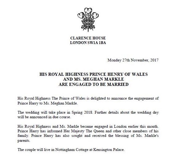 Στη δήλωση ο Χάρι ανακοινώνει ακόμη ότι έχει ενημερώσει τη βασίλισσα της Αγγλίας Ελισάβετ Β’ όπως και ότι έχει λάβει την ευλογία των γονέων της μέλλουσας νύφης.