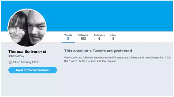 Ετσι, δεν αποφεύγει τις γκάφες: Το όνομα χρήστη του Twitter που πληκτρολόγησε ο αμερικανός πρόεδρος δεν ήταν αυτό της πρωθυπουργού της Βρετανίας. Ανήκει σε μια Τερέζα Σκρίβενερ η οποία έχει κάνει εννέα μόνο αναρτήσεις, ακολουθεί 103 χρήστες και έχει έξι ακολούθους. Επειδή είναι κλειδωμένο το προφίλ της, μόνο οι μετρημένοι ακόλουθοί της μπορούν να δουν τις δημοσιεύσεις της. Ούτε καν ο Ντόναλντ Τραμπ.
