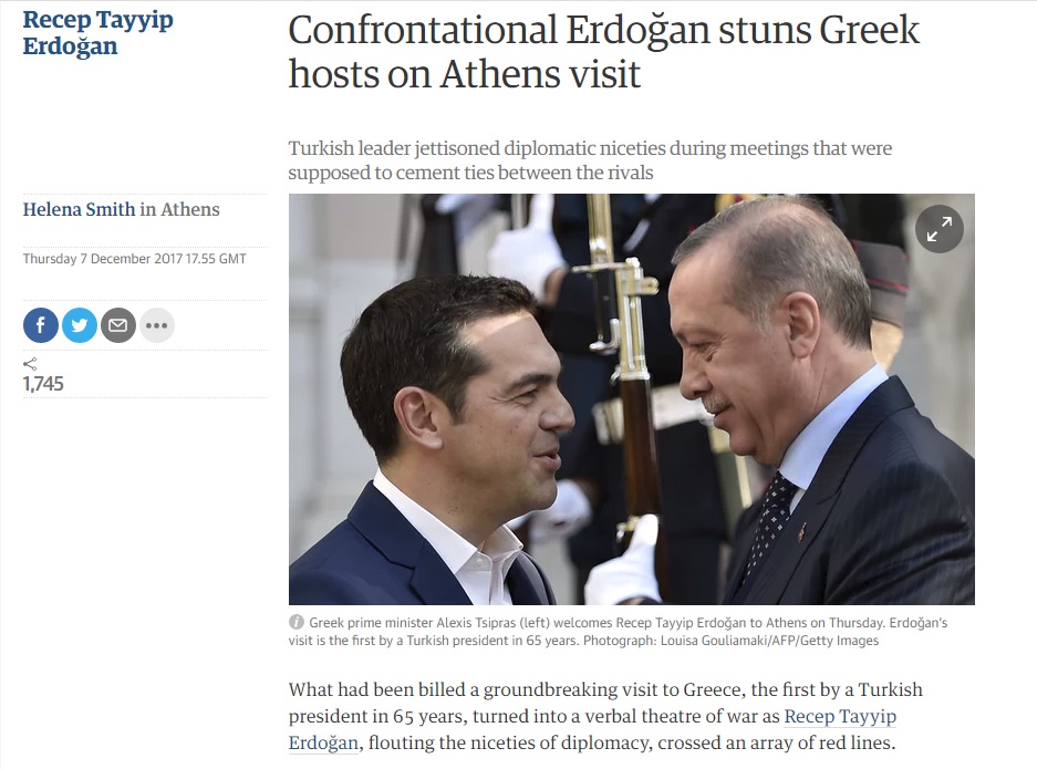 Αυτή που είχε διαφημιστεί σαν ιστορική επίσκεψη στην Ελλάδα, κατέληξε σε θέατρο λεκτικού πολέμου, καθώς ο Ερντογάν άφησε στην άκρη την αβρότητα της διπλωματίας και παραβίασε πολλές κόκκινες γραμμές γράφει η ίδια.