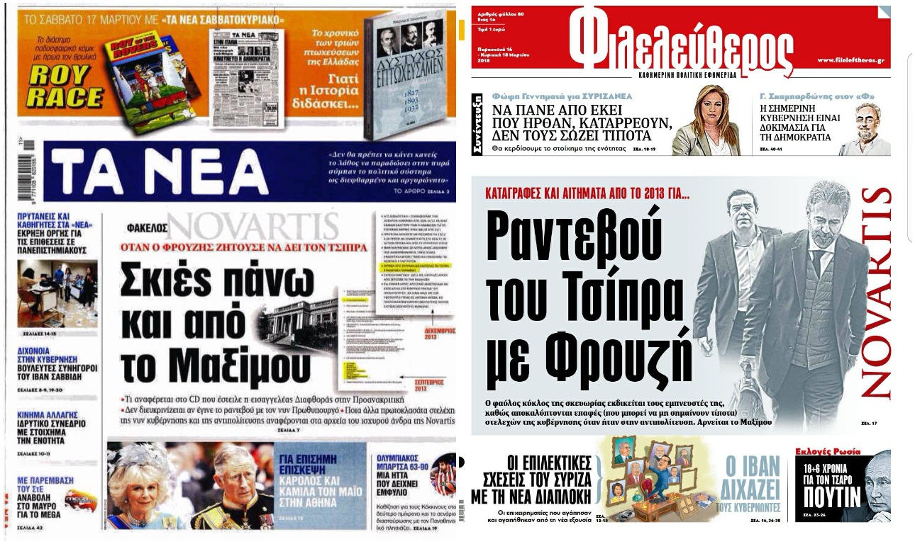 Για τον αντιπολιτευόμενο Τύπο το θέμα ακυρώνει την εργαλειοποίηση την υπόθεσης Νovartis από την κυβέρνηση έναντι των πολιτικών της αντιπάλων. «Σκιές πάνω από το Μαξίμου – Οταν ο Φρουζής ζητούσε να δει τον Τσίπρα», γράφουν «Τα Νέα» στο φύλλο της Παρασκευής. «Ραντεβού του Τσίπρα με Φρουζή – Ο φαύλος κύκλος της σκευωρίας εκδικείται τους εμπνευστές της», γράφει ο «Φιλελεύθερος».