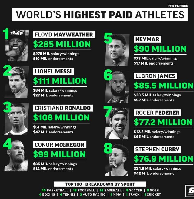 Στη πρώτη θέση της σχετικής λίστας βρίσκεται ο πυγμάχος, Φλόιντ Μέιγουέδερ, και τον ακολουθούν τα δύο μεγάλα αστέρια του ποδοσφαίρου, Λιονέλ Μέσι και Κριστιάνο Ρονάλντο. Η μέση ηλικία των 100 πιο ακριβοπληρωμένων αθλητών του Forbes είναι τα 31 έτη, ενώ οι αθλητές του γκολφ Φιλ Μίκελσον (48 ετών) και 42χρονος Τάιγκερ Γουντς είναι οι πιο ηλικιωμένοι της λίστας. Στην 4η θέση είναι ο πυγμάχος Κόνορο MακΓκέγκορ με 99 εκατ. δολάρια και την πρώτη 5άδα συμπληρώνει ο Βραζιλιάνος Νεϊμάρ με 90 εκατ.