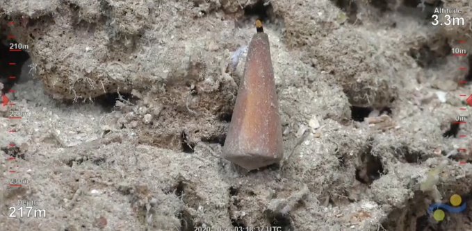 Γύρω από τη δομή, το ρομποτικό σκάφος εξερεύνησης εντόπισε ασυνήθιστα όστρακα, κοπάδια ψαριών και καρχαρίες, γράφει ο Telegraph.