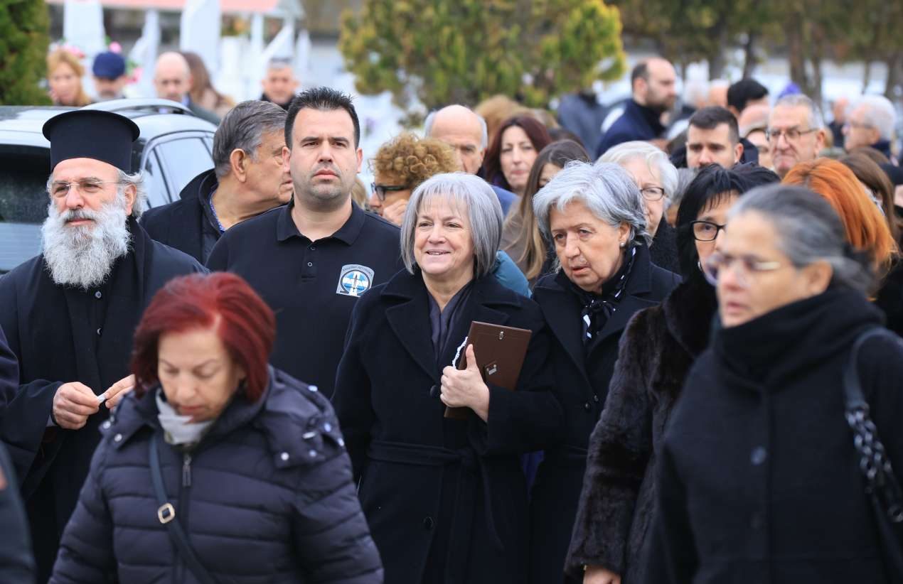 Παρούσα στην κηδεία και η πρόεδρος του Συλλόγου Συγγενών Θυμάτων «Τέμπη 2023», Μαρία Καρυστιανού (φωτ. κάτω), λίγες ώρες μετά την επίθεση που εξαπέλυσε σε βάρος της ιατροδικαστή Λάρισας, Ρουμπίνης Λεονταρή, που εξέτασε τη σορό του.