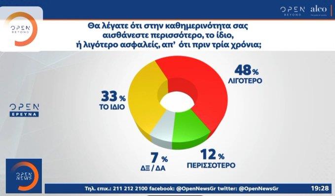 Tέλος, το 48% δηλώνει ότι νιώθει λιγότερο ασφαλές από ό,τι πριν τρία χρόνια, το 33% νιώθει το ίδιο και το 12% νιώθει περισσότερο.