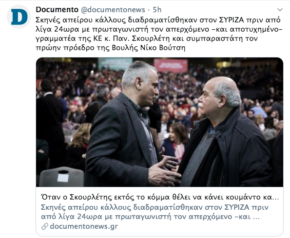 Αυτό φαίνεται ότι αναγνώρισε και το «Documento» που το βράδυ του Σαββάτου έσπευσε να περιγράψει τον κ. Σκουρλέτη ως «απερχόμενο» και «αποτυχημένο» γραμματέα του ΣΥΡΙΖΑ και τον κ. Βούτση ως συμπαραστάτη του.