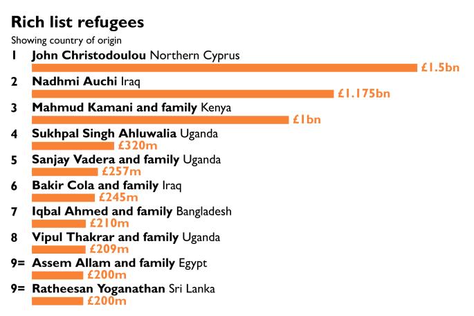 Εφυγαν κυνηγημένοι από πολέμους ή/και απολυταρχικά καθεστώτα και πολλές φορές, όταν κατάφεραν τελικά να φθάσουν στη Βρετανία (που αποτελούσε εξαρχής χώρα προορισμού τους), δεν είχαν ούτε πένα στην τσέπη τους. Στη φετινή λίστα όμως των Sunday Times με τους 1.000 πλουσιότερους κατοίκους του Ηνωμένου Βασιλείου (Sunday Times Rich List), φιγουράρουν 15 πρώην πρόσφυγες, η συνολική περιουσία των οποίων ξεπερνά τα 6 δισ. στερλίνες.