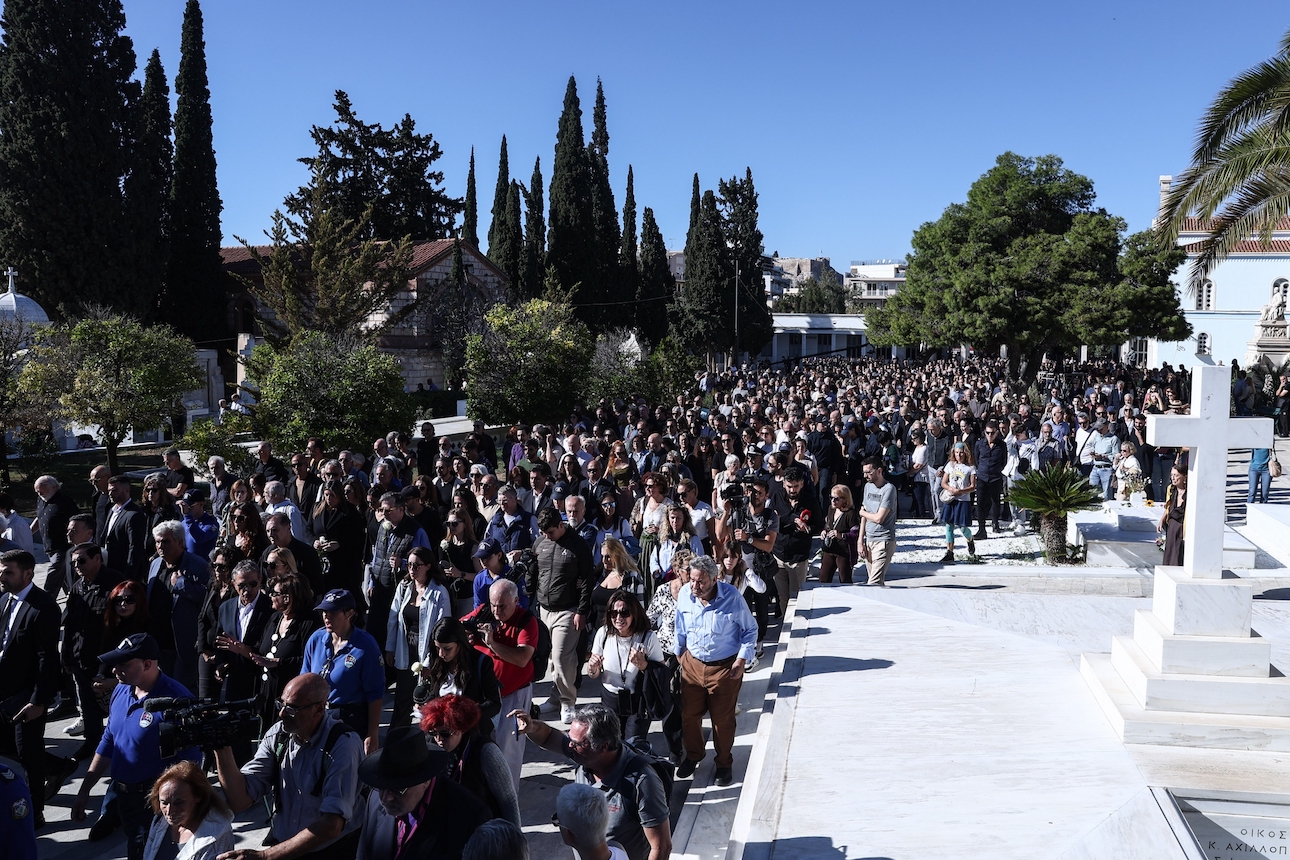 Οι γενιές των ελλήνων τραγουδοποιών, τραγουδιστών και ερμηνευτριών αποχαιρετούσαν έναν από τους μεγάλους που τους έδωσε κάποτε «φωνή». Τον τρόπο να γράφεις τραγούδια στην ελληνική γλώσσα με σεβασμό στην παράδοση, αλλά και στην ελευθερία. Να σπας τους κανόνες και να μην υπολογίζεις τις «γλώσσες τις στραγγαλίστριες». Γι’ αυτό η έτσι κι αλλιώς λιτή τελετή απέκτησε κάτι από την εικόνα του αρχαίου Χορού όταν ένας ένας και μία μία οι καλλιτέχνες εναλλάσσονταν ως «συνοδοί» του εκλιπόντος σε τέσσερα σημεία μπροστά από την ωραία Πύλη. Από τον Γιώργο Νταλάρα, τον Μανώλη Μητσιά και την Ελευθερία Αρβανιτάκη έως τον Νίκο Πορτοκάλογλου, τον Βαγγέλη Γερμανό, τον Κώστα Μαραβέγια και την Ελεωνόρα Ζουγανέλη (δεν έχει νόημα η πλήρης απαρίθμηση, έτσι κι αλλιώς, καθώς οι καλλιτέχνες κατέφταναν κατά δεκάδες).