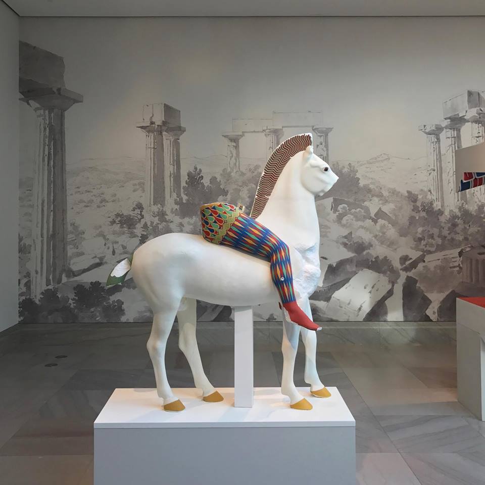 Δεν είναι κρυφό πλέον πως τα αρχαία ελληνικά αγάλματα έφεραν και έντονα και «μοντέρνα», με μια έννοια, σχέδια και δη χρωματισμένα. Δίπλα στον Πέρση ιππέα (ή Σκύθη ιππέα, του 520 π.Χ., που γλίτωσε από τον Eλγιν καθώς αποκαλύφθηκε το 1886 κοντά στο Ερέχθειο), στον οποίο ο χρόνος έχει χαριστεί τουλάχιστον ως προς τα χρώματα στα ρομβοειδή σχέδια της στολής του, το Μουσείο της Ακρόπολης εκθέτει σήμερα και μια υφαντή εκδοχή για το ύφασμα, όπως προκύπτει από το έγχρωμο γλυπτό.
